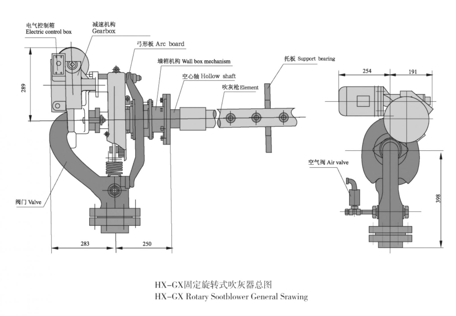HX-GX吹灰器主要由鵝頸閥、空心軸、吹灰槍、減速傳動機(jī)構(gòu)與弓形板、電氣控制箱、爐墻接口裝置、爐內(nèi)托板 等組成。